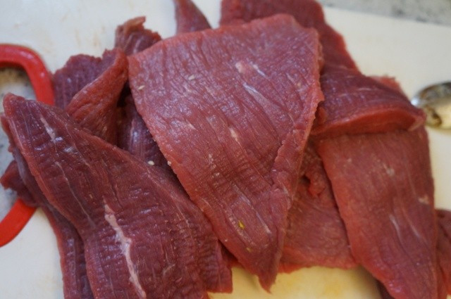 - Bước 1: Thịt bò bạn đem rửa sạch, sau đó đem cắt thịt bò thành từng lát dày khoảng 0,5 cm. Bạn cần phải chú ý cắt dọc thớ để thịt bò khô được dai và ngon và đẹp mắt. Tiếp đến sau đó bạn đem cho các loại gia vị, đường, nước tương, muối và rượu nấu ăn vào thịt bò đã cắt, trộn thật đều những chú ý bóp nhẹ để gia vị được thấm sâu vào thịt bò hơn.