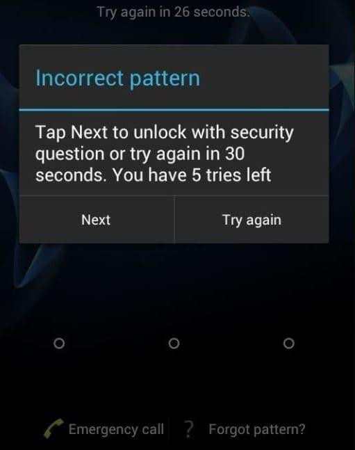 Nếu máy bạn đang chạy Adroid 4.4 trở xuống, hãy thử ngay tính năng thông minh Forgot Pattern này. Sau khi đăng nhập sai mật khẩu quá 5 lần, hệ thống sẽ hiện thông báo thử lại trong 30 giây. Trong lúc nó đang hiển thị nhấn vào dòng chữ Forgot Pattern ở cuối màn hình.