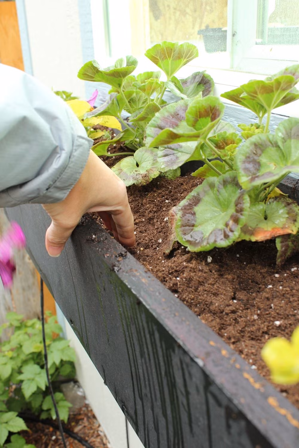 Khi chiếc máng gỗ được cố định trên tường, bạn bắt đầu đổ đất và phân, mùn cưa vào để trồng hoa.