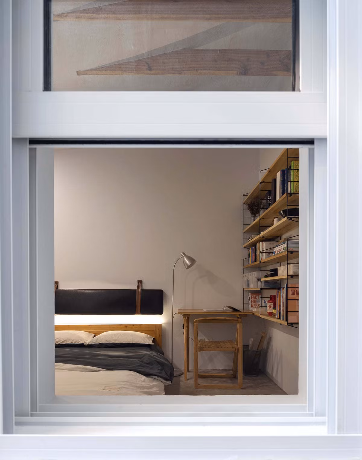 Tổng mức đầu tư được giảm bớt do kết cấu vì kéo mái và nội thất được làm từ gỗ xoan từ vườn quê. Ông bà của chủ nhà đã trồng các cây xoan từ nhiều năm và không ngờ chúng trở thành món quà cho ngôi nhà của cháu nội. Góc ngồi đọc sách thật chill cho gia chủ.