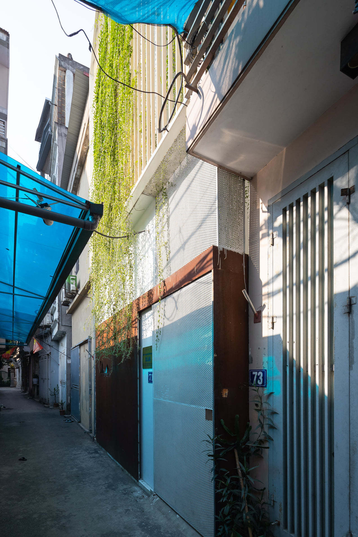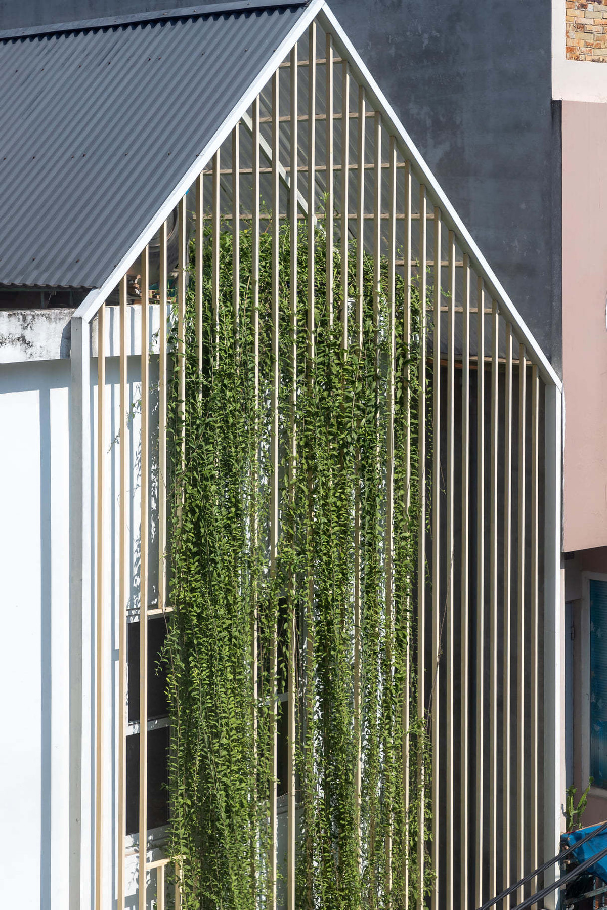 Mặt tiền được bao bọc bởi cây dây leo xanh tươi, đầy sức sống, khác hẳn với những công trình lân cận.