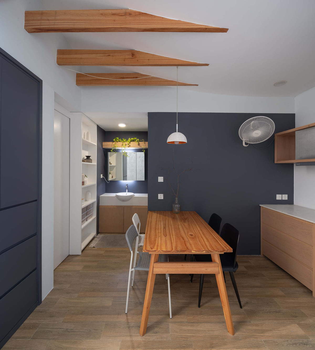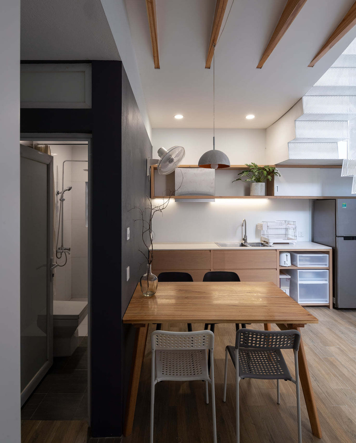 Bếp và bàn ăn nhỏ xinh, bố trí hợp lý. Sự thay đổi chất liệu sàn từ xi măng sang gỗ để phân chia không gian chính - phụ.