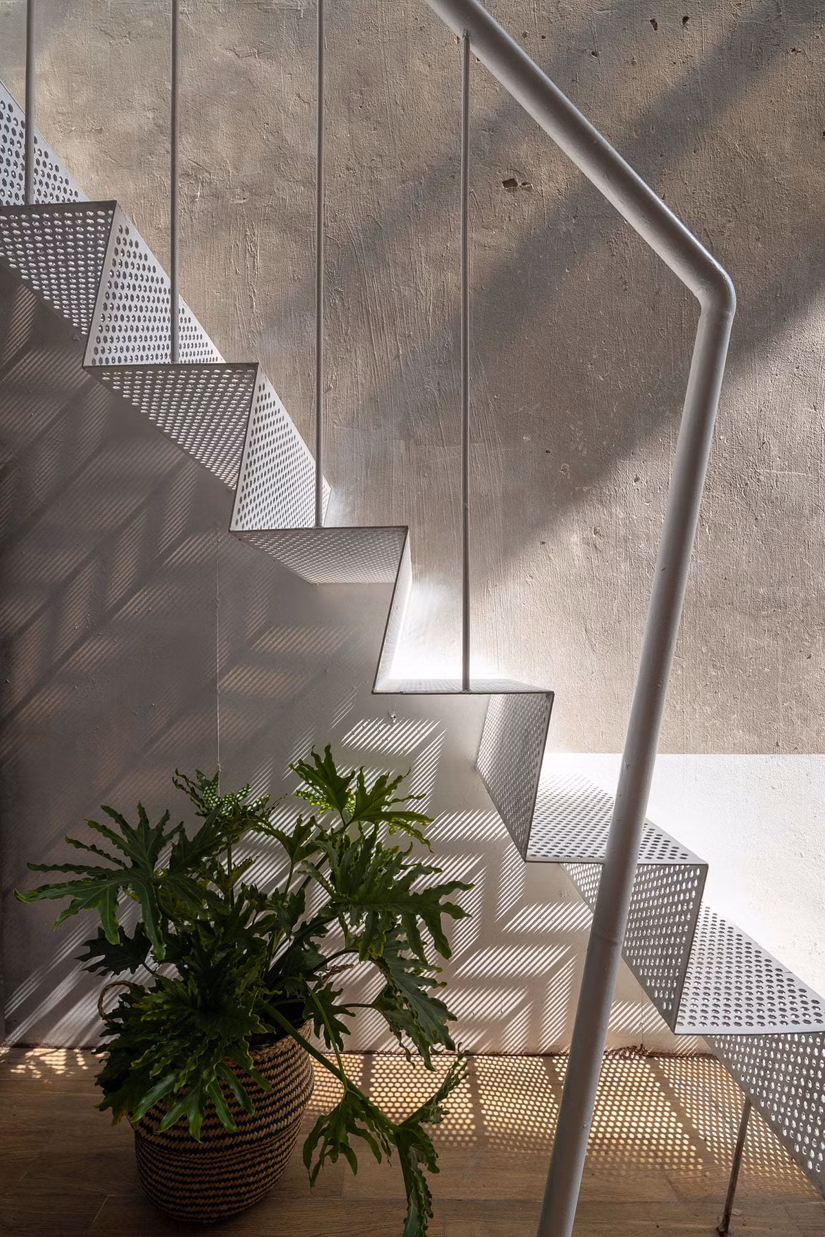 Cầu thang sắt lỗ được tạo ra để kết nối tầng 1 và tầng 2 nhưng vẫn đảm bảo ánh sáng lọt xuống khu bếp vào ban ngày.