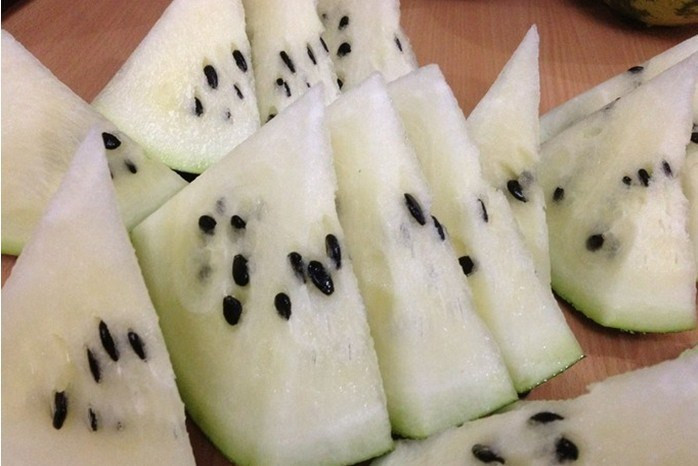Thay vào đó, quả dưa hấu cụ bà đập lại có màu trắng rất kỳ lạ, nhìn chẳng giống loại dưa chưa chín vì thực ra ruột rất mọng nước.