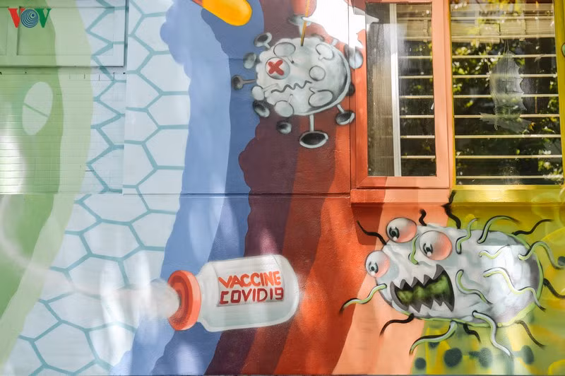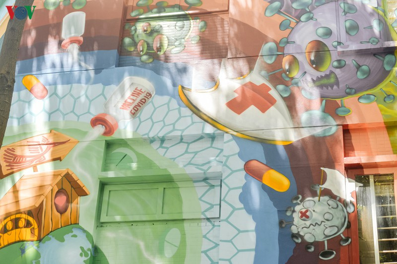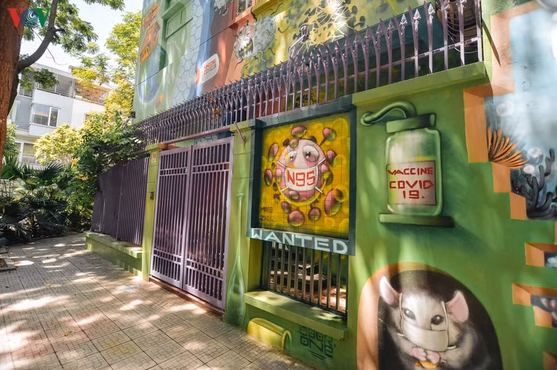 Nội dung các hình vẽ trên những bức tường của căn biệt thự này nhằm tuyên truyền, cổ động phòng chống dịch COVID-19.