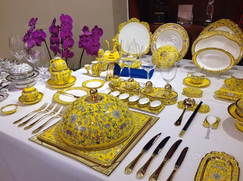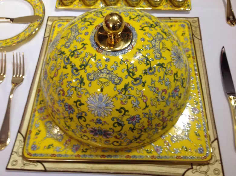 Theo thiết kế, bộ dùng trong yến tiệc lấy cảm hứng từ các bức tranh tường cổ và màu nền của màu vàng - tượng trưng cho sự uy nghi trong truyền thống Trung Quốc.