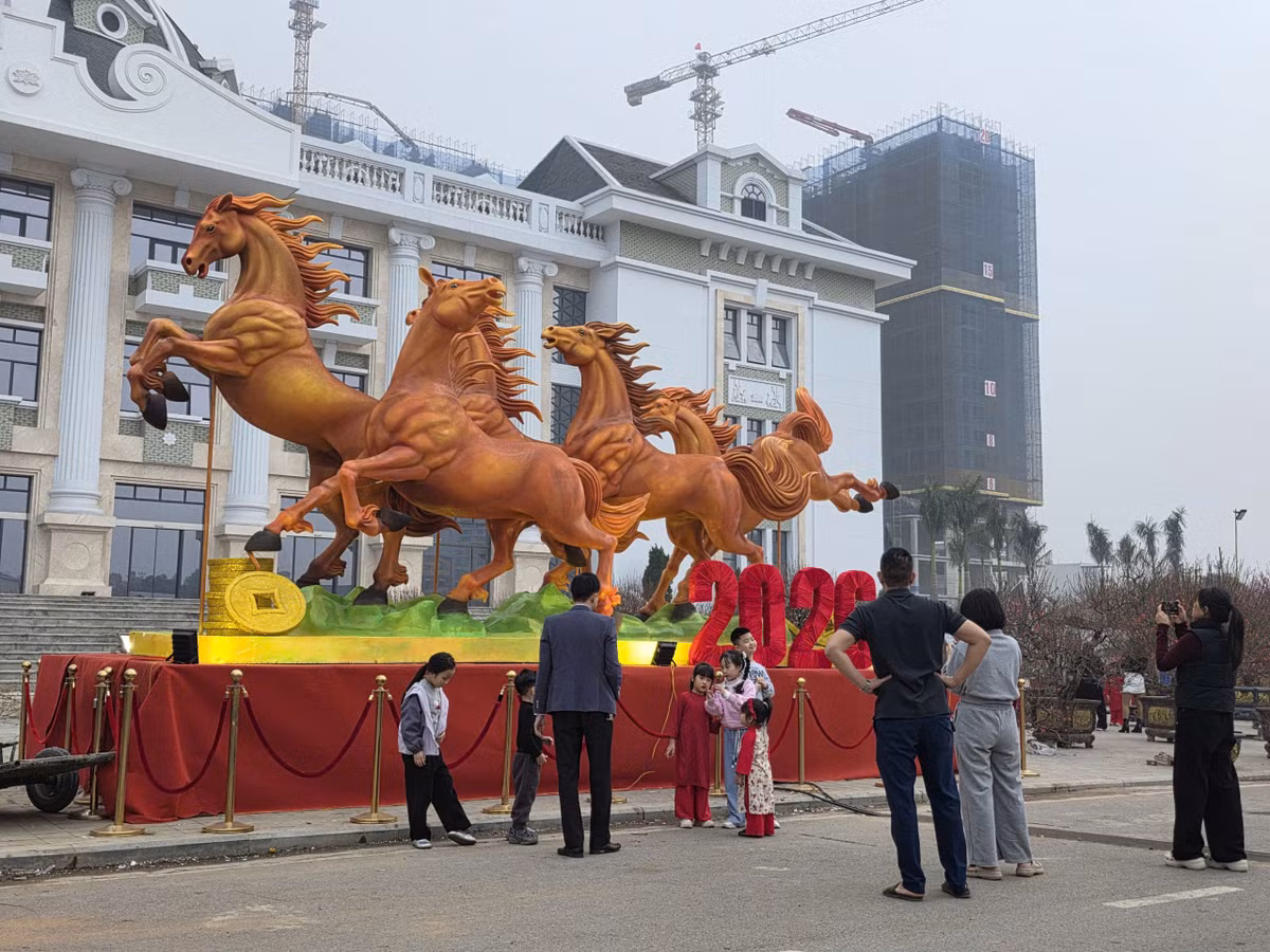 Cụm linh vật ngựa Bính Ngọ 2026 tại quảng trường trung tâm Phú Thọ đã hoàn thiện, gây ấn tượng với tạo hình tả thực, độc đáo và đầy khí thế.