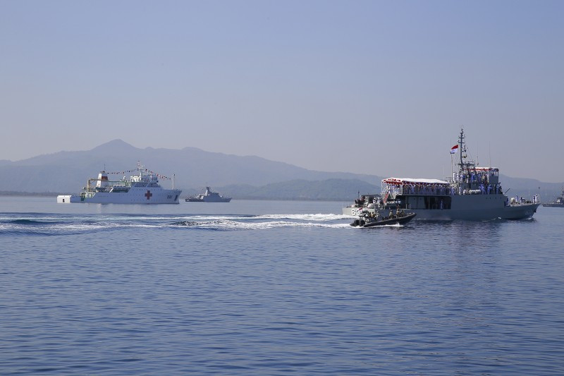 Sĩ quan liên lạc của Hải quân Indonesia cùng kíp chỉ huy điều khiển Tàu bệnh viện 561 tham gia diễn tập trên biển.
