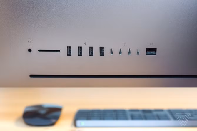 iMac Pro được trang bị 4 cổng USB-C giao tiếp Thunderbolt 3, 4 cổng USB-A, 1 cổng Ethernet 10Gb, khe thẻ nhớ SDXC hỗ trợ UHS-II và jack tai nghe 3.5mm. Màn hình của máy tương tự iMac 27 inch 5K nhưng chất lượng thì "Pro" hơn nhiều.
