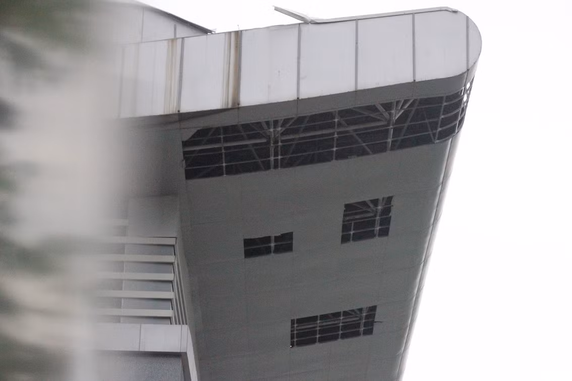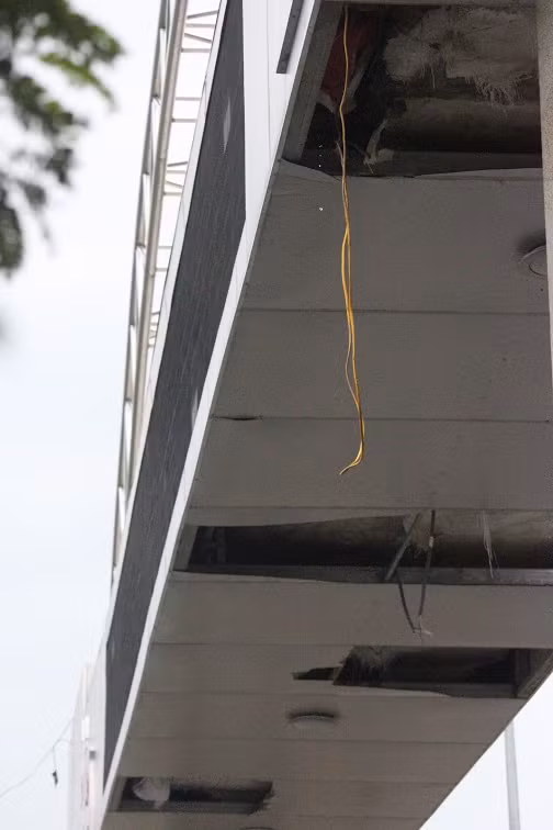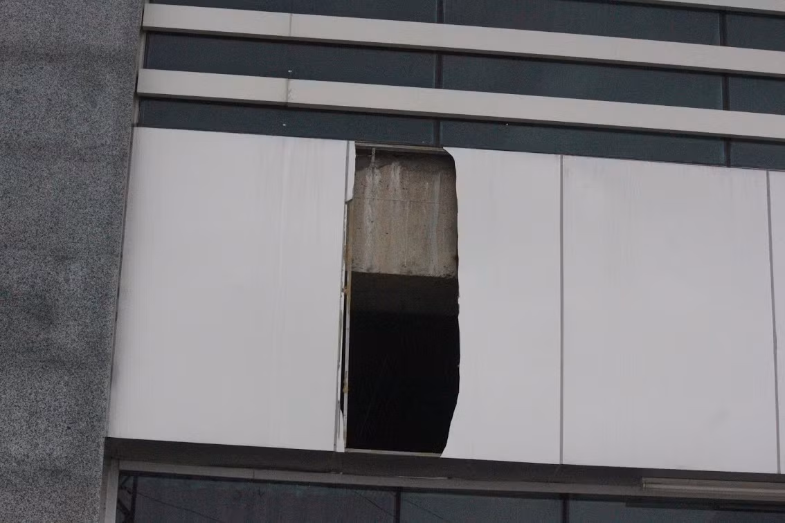 Những vết thủng lớn xuất hiện trên tường nhà thi đấu.