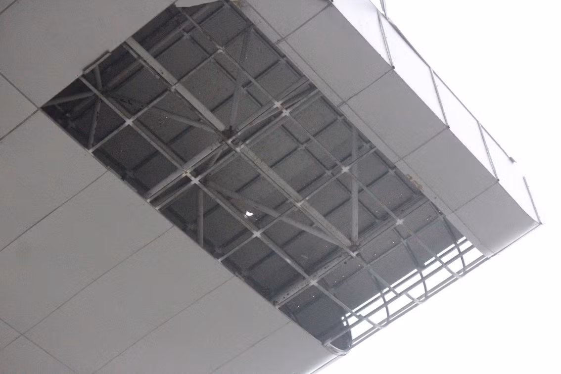 Các tấm ốp trần nhà thi đấu bong tróc từng mảng lớn.