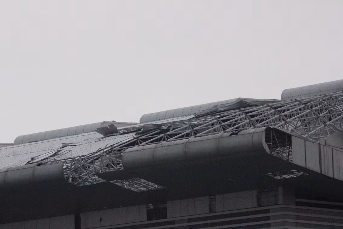 Sáng 18/8, ghi nhận của PV Kiến Thức, phần các tấm lợp trên mái nhà thi đấu tỉnh Thái Bình đã bị hư hỏng trên diện rộng.