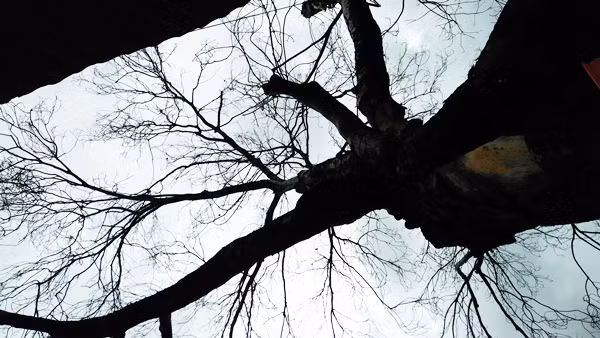 cây sấu đã chết nhưng trên thân cây vẫn còn lớp vải quấn xung quanh nhằm bảo vệ cây khỏi ánh nắng mặt trời.