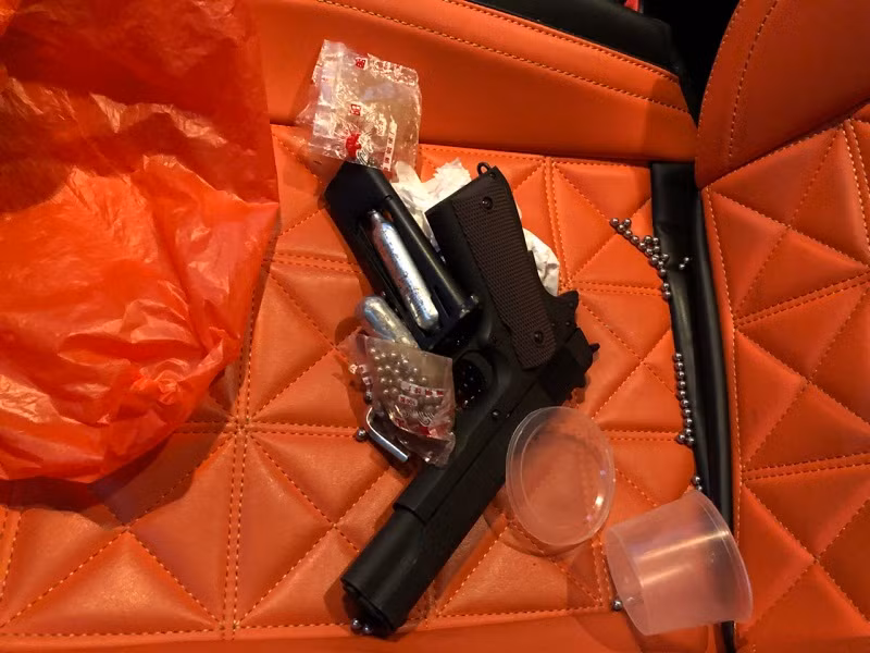 Quá trình bắt quả tang và khám xét khẩn cấp địa điểm tổ chức đánh bạc trên, thu giữ 1 bộ bát đĩa, 4 quân vị hình tròn, 2 xe ô tô, 15 điện thoại di động các loại, 3 khẩu súng (trong đó có 1 khẩu dạng K54 bắn bi, 1 khẩu súng bắn đạn hoa cải, 1 khẩu súng bắn hơi) và 18 viên đạn cùng 103.802.000đ tiền mặt. Ảnh: Công an tỉnh Hưng Yên.