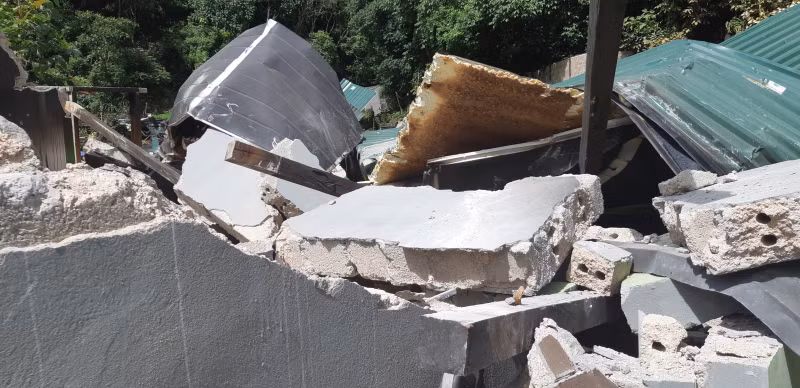 | Mái nhà bằng tôn và hàng rào thép B40 nằm ngổn ngang giữa đống đổ nát |