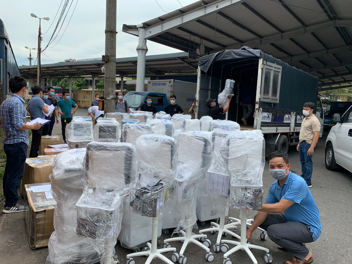 Đại diện BV Bạch Mai cho biết, trong số chuyến hàng vận chuyển lần này vào TP.HCM có 15 máy thở oxy dòng cao, 45 monitor, 80 bơm tiêm điện, 80 máy truyền dịch, 01 máy lọc máu liên tục cùng nhiều thiết bị máy móc khác.