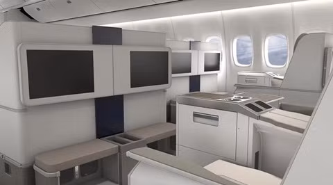 Nội thất bên trong được thiết kế rất sang trọng với ghế da, đồ sứ xuất xứ từ Mỹ và các đồ dùng bằng thủy tinh đẹp mắt. Cùng với dịch vụ đẳng cấp 5 sao, các hành khách sẽ có quản gia trên máy bay trong suốt chuyến đi, thực đơn ăn uống lấy cảm từng từ các nhà hàng gắn sao Michelin.