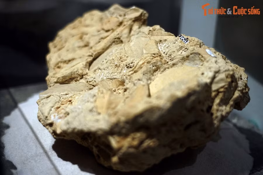 Đây là một mẫu đá travertine chứa nhiều lá cây hóa thạch, hiện vật của Bảo tàng Hóa thạch Hà Nội. Khác với nhiều mẫu hóa thạch khác, hóa thạch lá cây này rất “trẻ”, có thời gian hình thành chỉ bằng tuổi nhiều người đang sống.