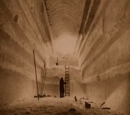 Căn cứ này được đưa vào hoạt động từ năm 1959 và ngừng làm việc vào năm 1966, khi sự dịch chuyển của khối băng khiến việc sinh sống trở nên bất khả thi. Giờ đây, căn cứ này đã bị chôn vùi dưới lớp tuyết dày của vùng Bắc Cực. Ảnh: Căn cứ trong quá trình xây dựng.