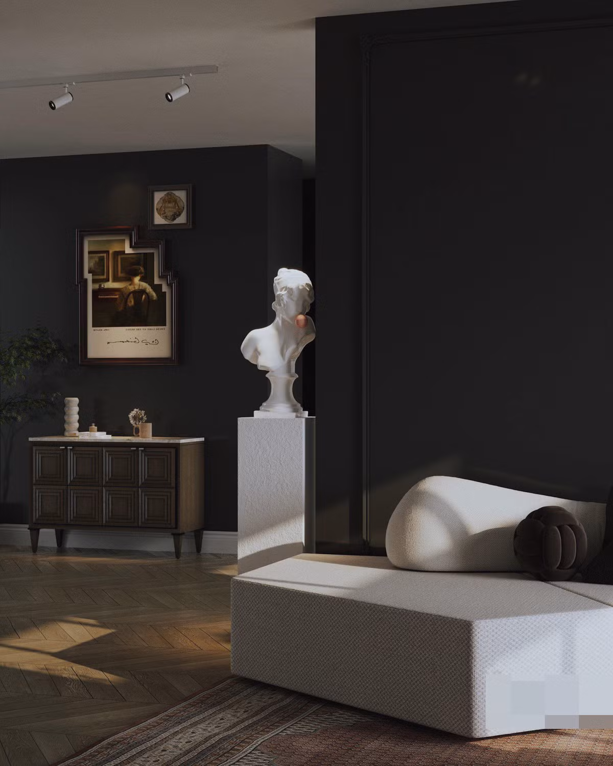 Phương án thiết kế ban đầu của căn hộ thiên về màu tối nhưng vẫn toát lên tinh thần hiện đại, sang trọng và đẳng cấp của phong cách tân cổ điển.