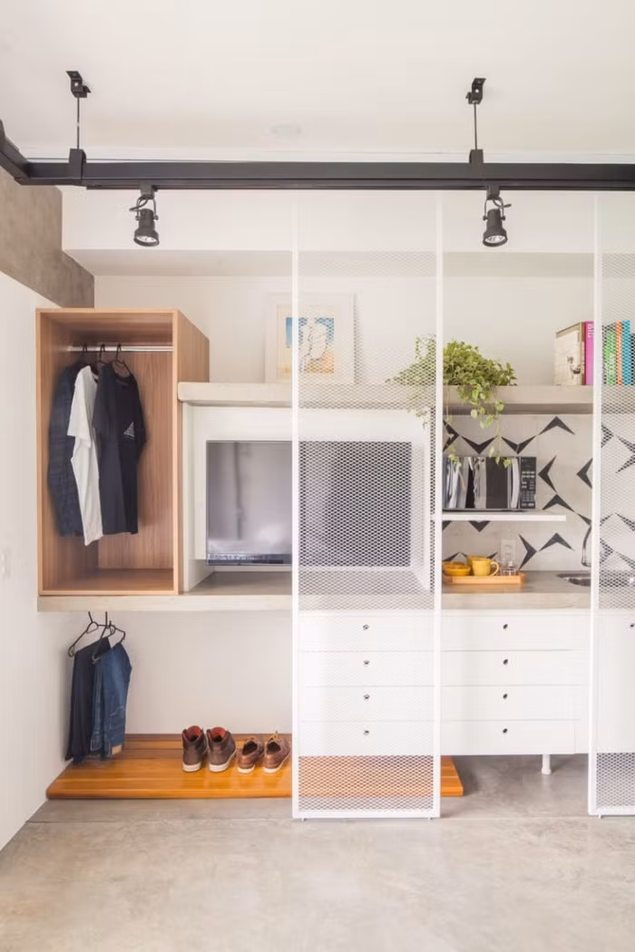 Nội thất trong căn hộ được thiết kế nhỏ gọn và tối giản nhất có thể nhằm tiết kiệm diện tích. Kệ TV, tủ đựng quần áo, kệ bếp...tất cả được bố trí trong một khoảng không gian nhỏ đến kinh ngạc!