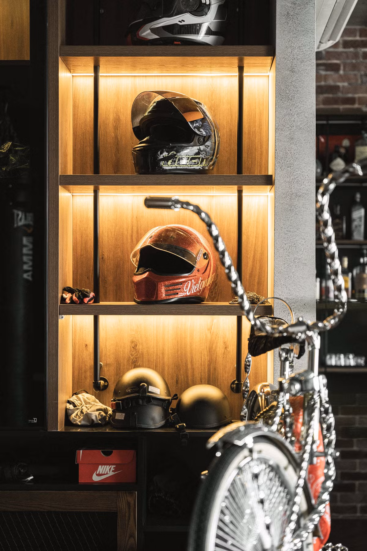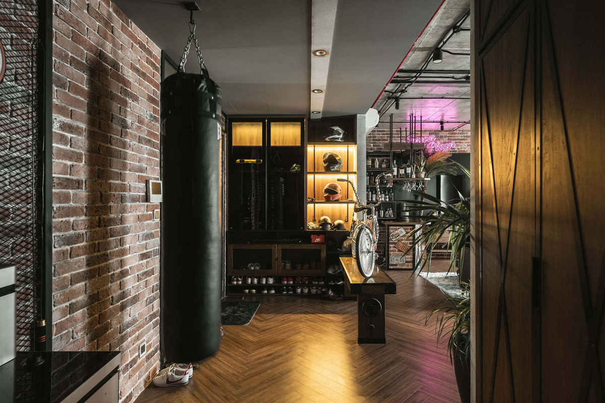 Sảnh vào và tủ giày, kết hợp khu tập boxing, trưng bày xe.