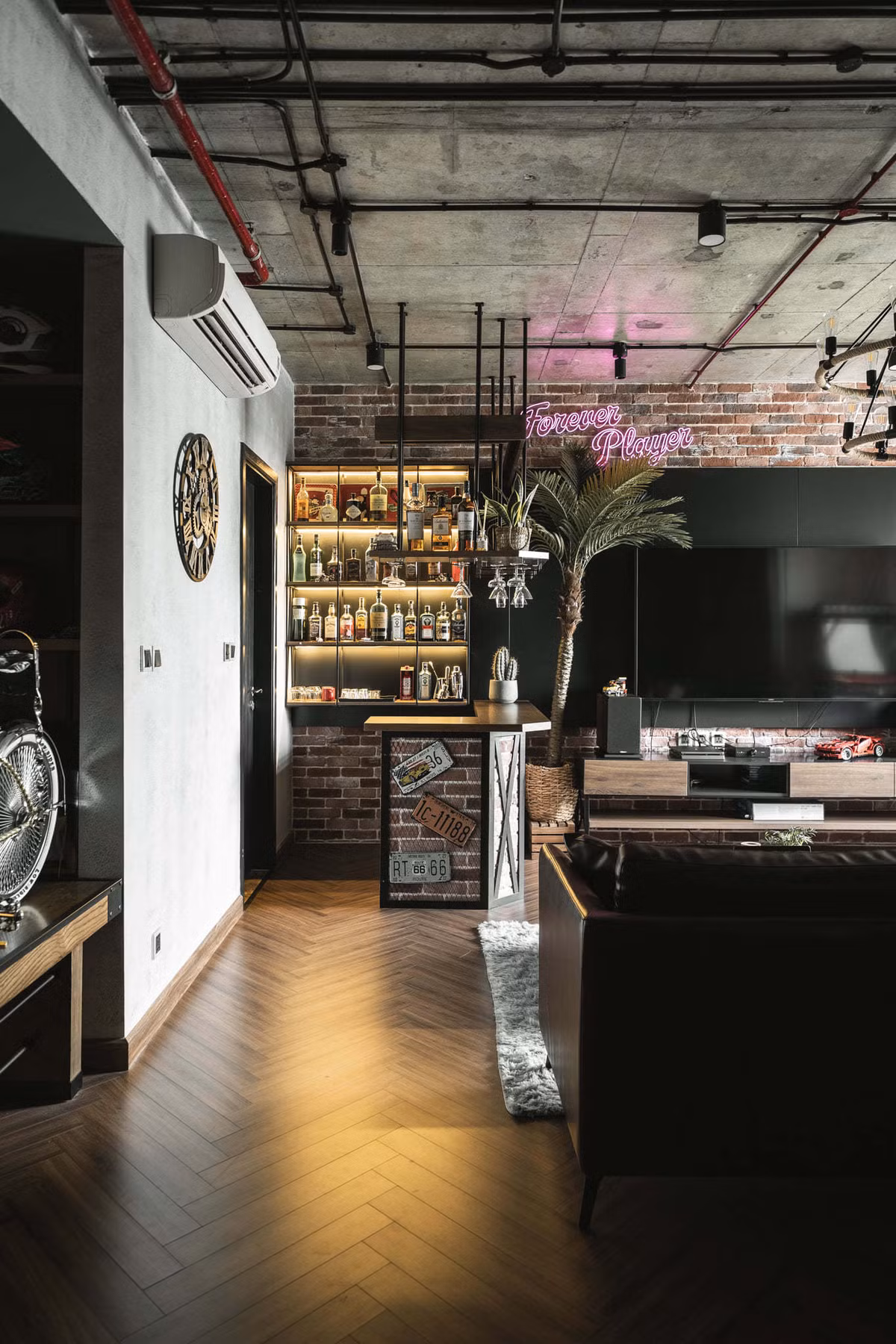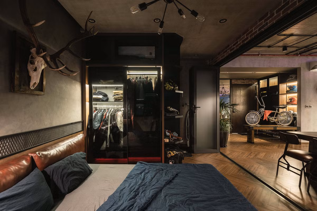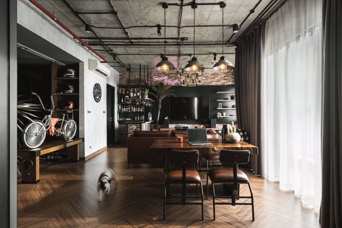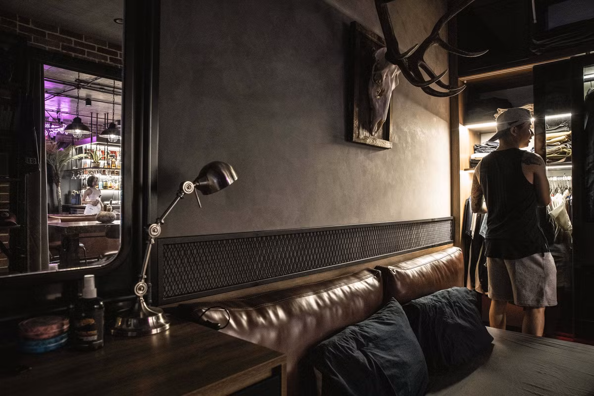 Anh kết hợp giữa phong cách Industrial (phong cách kiến trúc công nghiệp) pha trộn 1 chút âm hưởng của phong cách loft (là sự kết hợp giữa những yếu tố kim loại, công nghiệp và màu sắc hài hòa) trong cách bố trí đồ dùng, không gian để thêm sự tiện nghi.