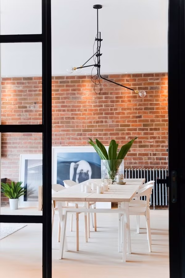 Từ khu vực lối vào nhà là không gian dành cho chức năng ăn uống hàng ngày của gia đình. Chỉ với bộ bàn ghế ăn đơn giản với sự kết hợp hài hòa giữa chất liệu kim loại làm chân bàn chắc chắn và gỗ màu sáng làm mặt bàn giúp cho góc ăn uống luôn đẹp giản dị. Những gam màu sáng của bộ bàn ghế ăn giúp cho không gian ăn uống trở nên dễ nhìn và cũng giúp căn hộ đẹp thoáng sáng hơn. Sàn nhà cùng với một phần của tường được chọn lựa gam màu sáng tương đồng với nội thất, giúp bức tường bằng gạch trần đẹp nổi bật và tinh tế.