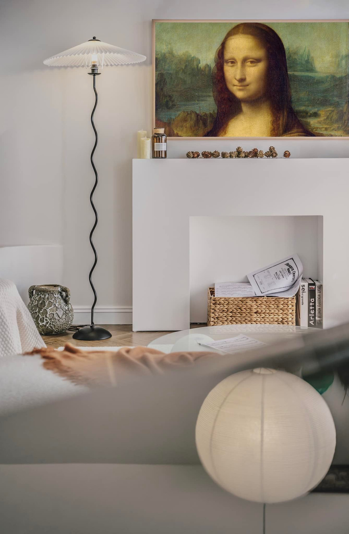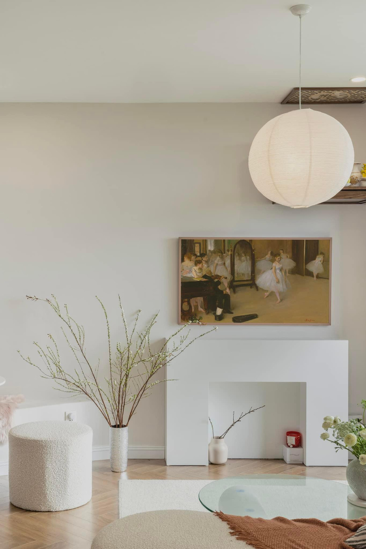 Góc decor, trưng bày khá thú vị bên chiếc lò sưởi giả. Bức tranh treo tường thực chất là tivi.