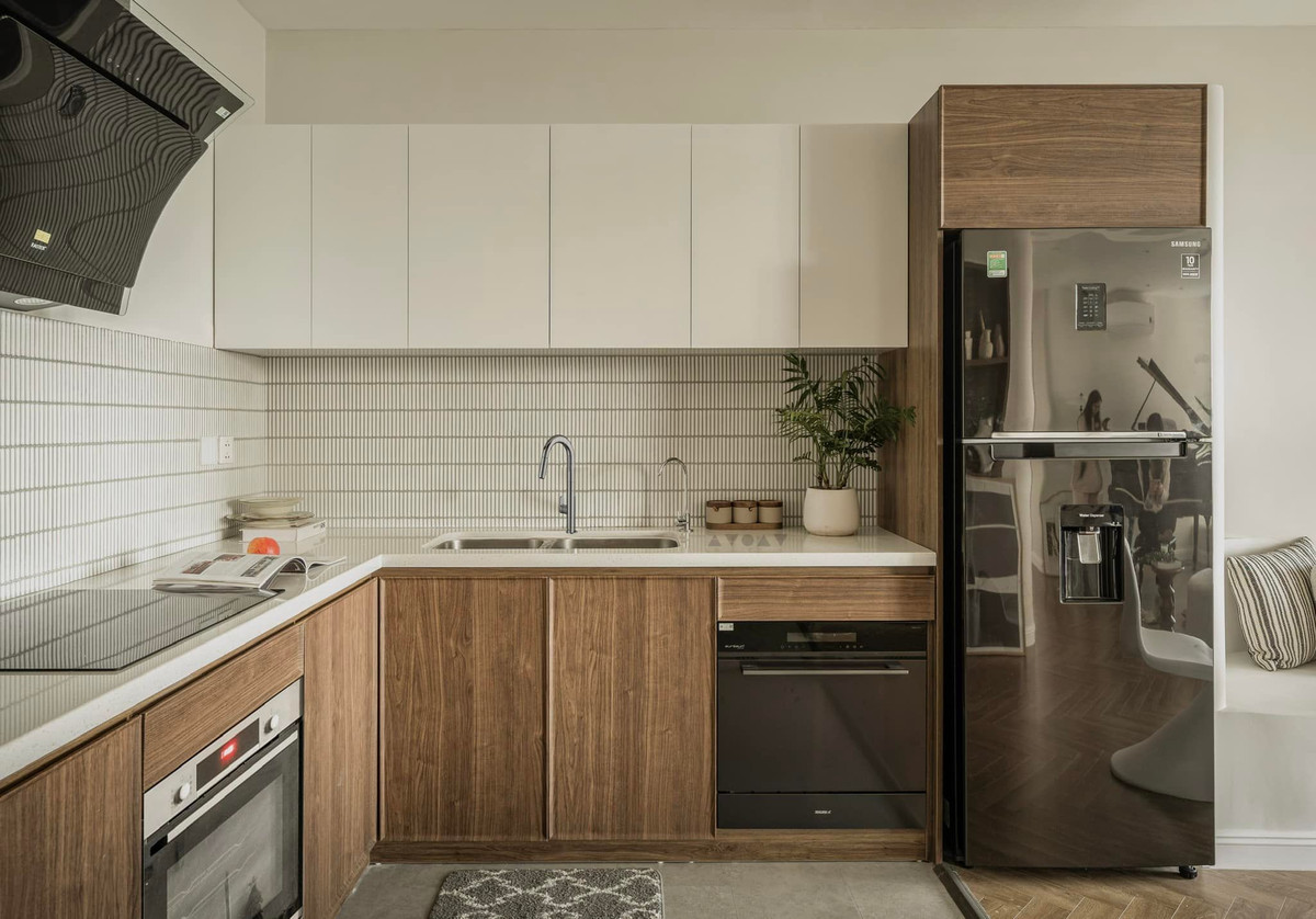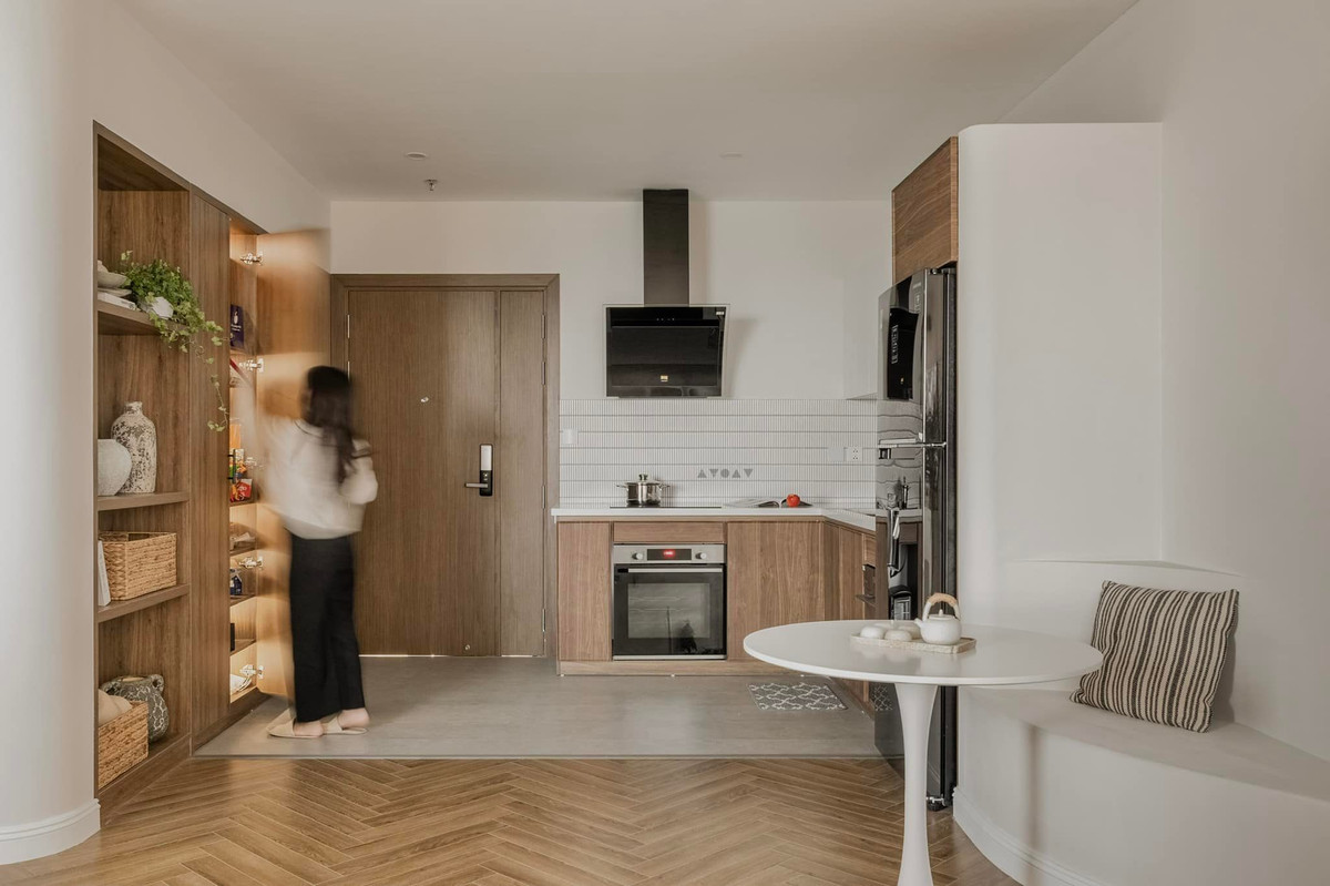 Bếp ngay lối cửa ra vào. Tủ giày âm tường kết hợp đựng đồ giúp trữ được rất nhiều đồ bếp lỉnh kỉnh và đồ ăn… Bếp nhỏ xinh nhưng vẫn đầy đủ công năng.