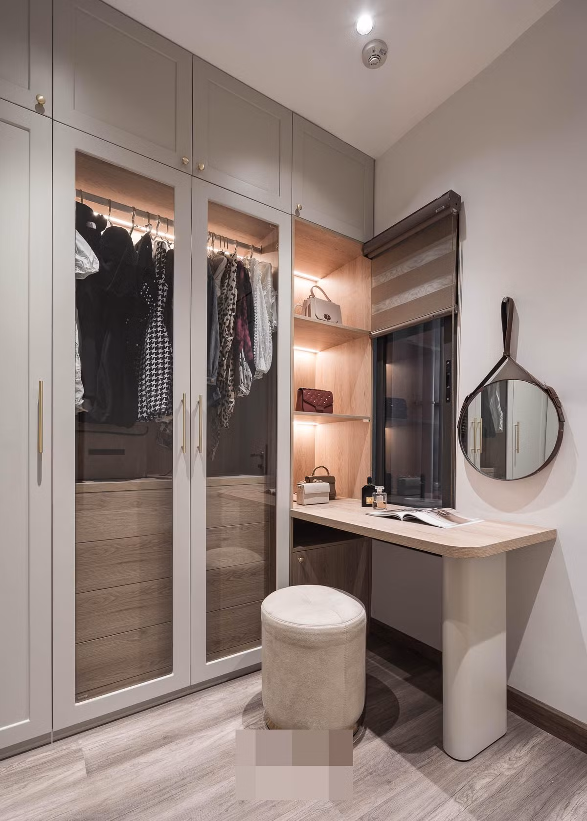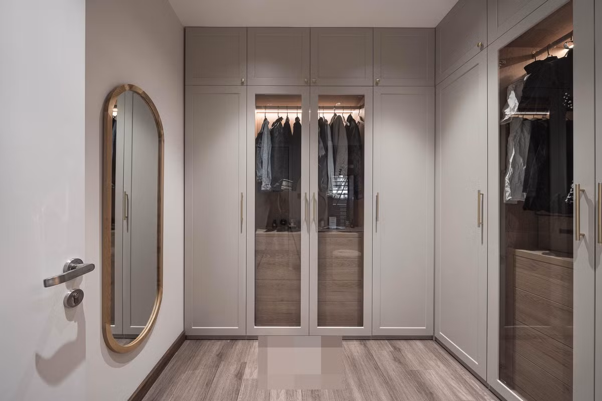 Phòng thay đồ lớn, kết hợp các tủ và kệ trưng bày hàng hiệu.
