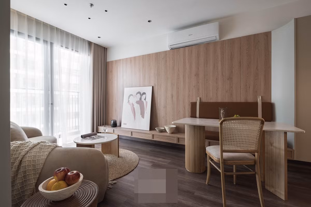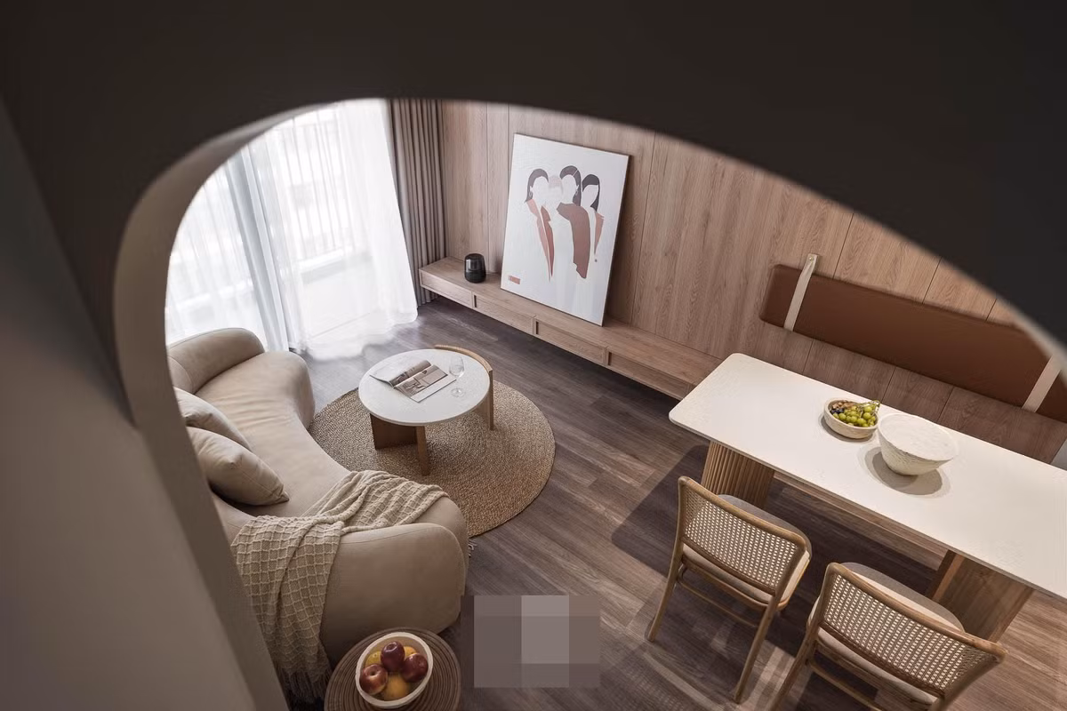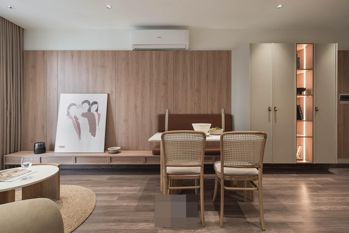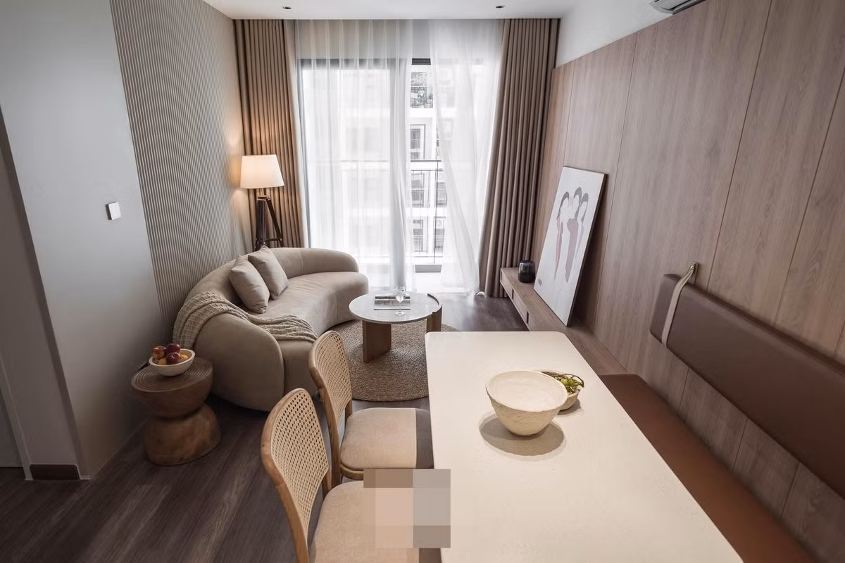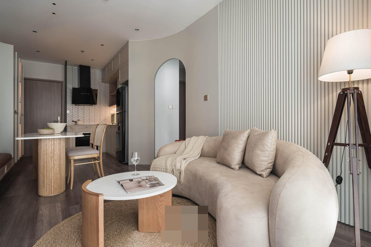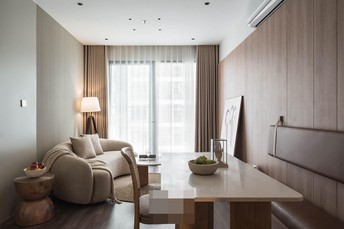 Tổng thể căn hộ sử dụng tone màu beige sáng Hàn Quốc, với nhiều đường cong mềm mại phối hợp với nhau như bàn trà, bàn ăn, ghế ăn...