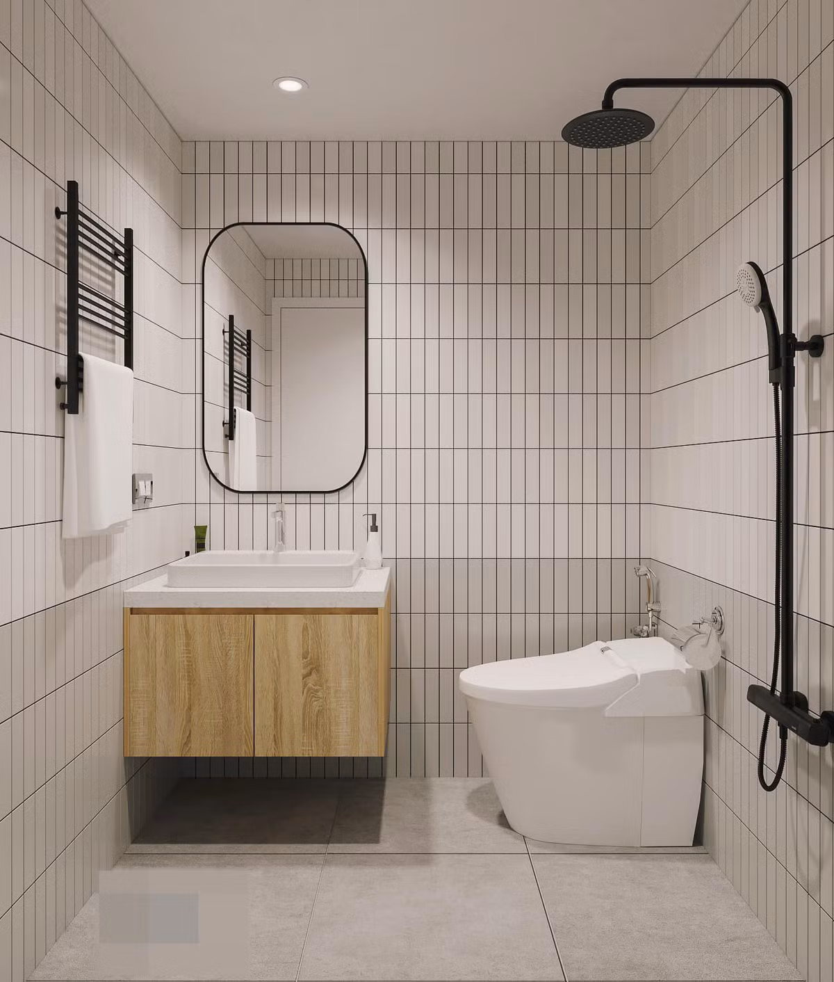 Hai phòng vệ sinh thiết kế giống nhau, sử dụng gạch thẻ ốp, dễ lau dọn.
