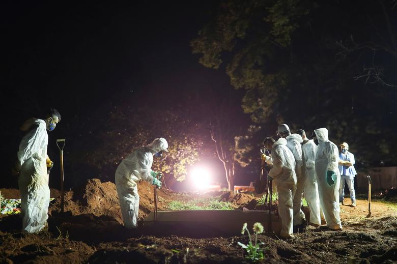 Trong bối cảnh Brazil ghi nhận kỷ lục về số ca tử vong hàng ngày vì COVID-19, việc tổ chức tang lễ và chôn cất thi thể người tử vong vì nhiễm virus SARS-CoV-2 được thực hiện cả vào ban đêm tại các nghĩa trang ở quốc gia Nam Mỹ này. (Nguồn ảnh: Reuters)