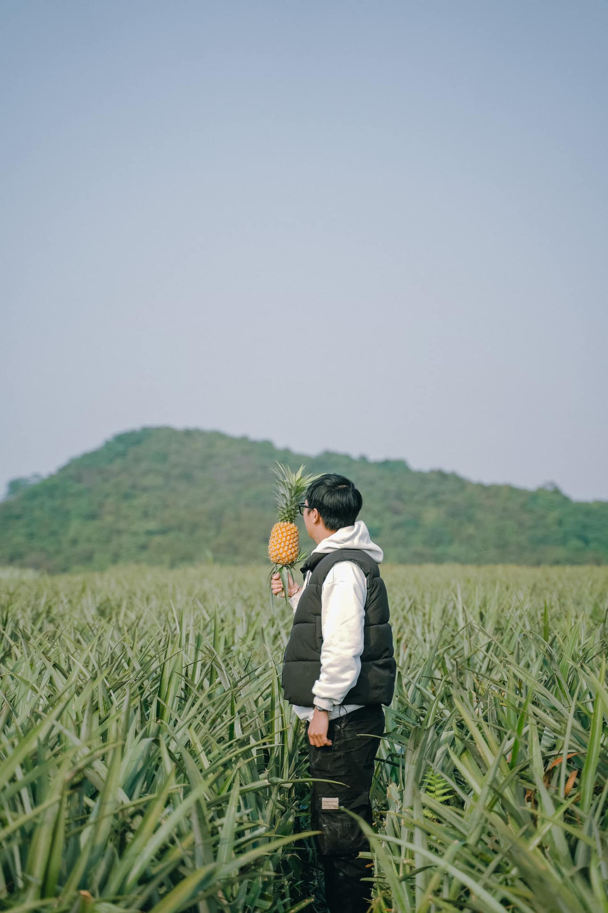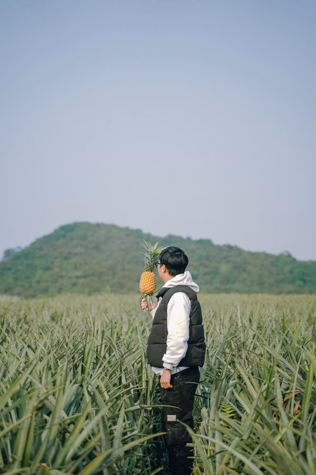 “Mình đến đây khi cánh đồng dứa vẫn còn xanh, tuy nhiên cũng lác đác một số quả chín. Có cô đang hái dứa, thấy chúng mình chụp hình nên cho một quả làm quả”, Lâm thích thú kể (Ảnh: Bùi Ngọc Lâm).