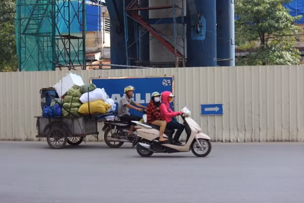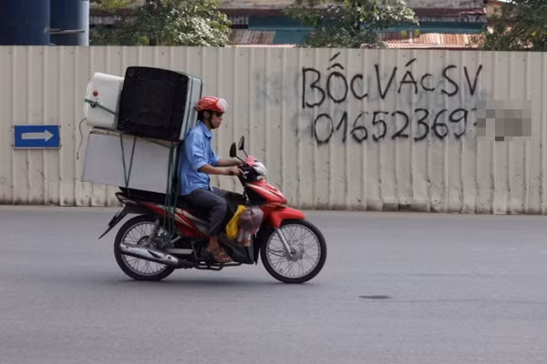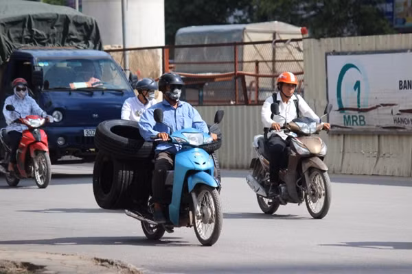 Hình ảnh xe máy chở hàng cồng kềnh trên đường Hà Nội.
