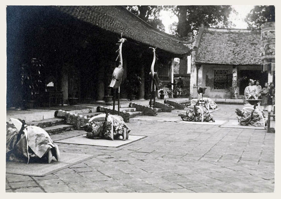 Cận cảnh một buổi lễ ở Văn Miếu Hà Nội thập niên 1920. Các vị chức sắc áo mũ chỉnh tề đang khấn vài trước một bàn thờ.