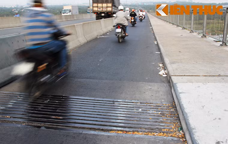 Dốc cầu trên làn đường xe máy hướng từ quận 7 sang quận 2 có biểu hiện sụt lún, tạo độ chênh lớn, đe dọa đến sự an toàn cho người tham gia giao thông.
