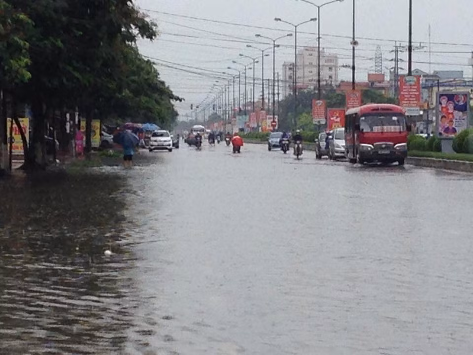 Tại đường Nguyễn Thị Duệ, Nguyễn Lương Bằng nước ngập kín cả vỉa hè.