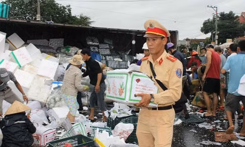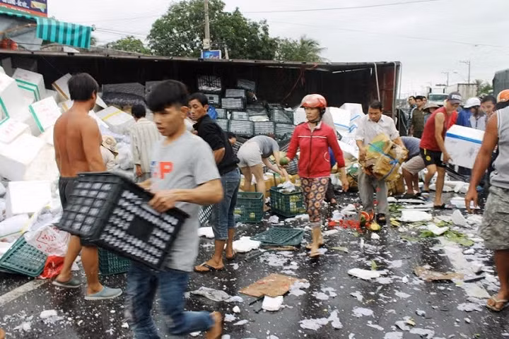 Sau vụ tai nạn nghiêm trọng xảy ra tại địa phận xã Cam Thành Bắc, huyện Cam Lâm (Khánh Hòa) làm cho cả 2 xe ô tô tải bị lật nghiêng. Thấy vậy, hàng trăm người dân không ngần ngại dầm mưa gom hàng giúp tài xế.