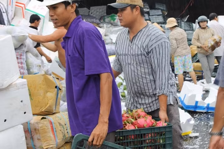 | Chùm ảnh Hàng trăm người dân dầm mưa giúp tài xế gom hàng trái cây |