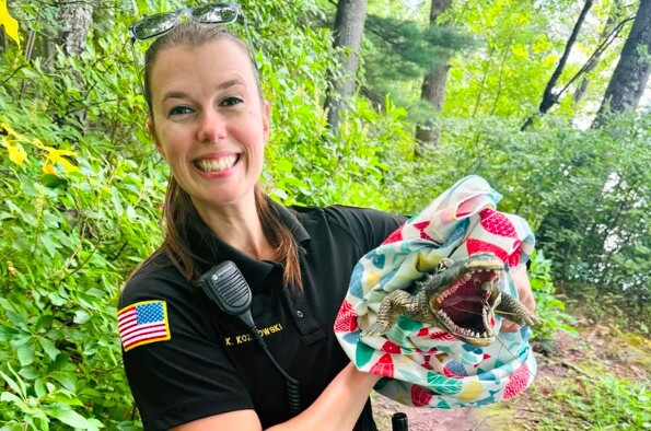 Cán bộ của cơ quan Kiểm soát Động vật Andover MA với con cá sấu đồ chơi.