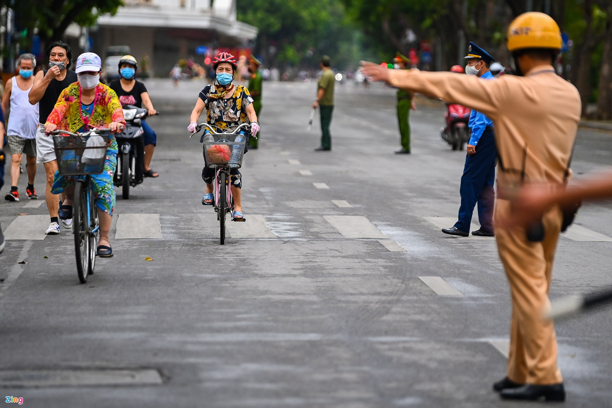 Lực lượng chức năng lập 6 chốt xung quanh hồ Gươm ngăn người dân đạp xe thể dục vào sáng sớm. Cảnh sát cũng nhắc nhở người đi bộ giữ khoảng cách và đeo khẩu trang.