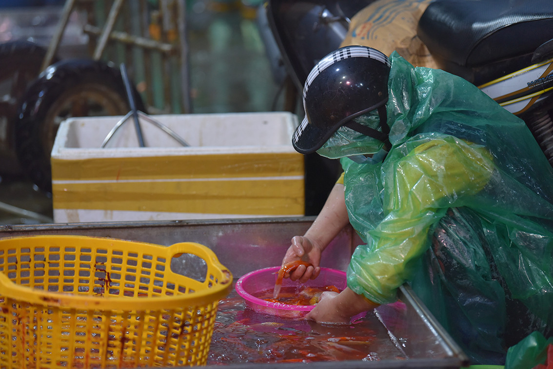 Năm nay các quầy bán cá cũng chỉ dám lấy ít cá đỏ nhỏ để bán cầm chừng chứ không dám nhập hàng nhiều.