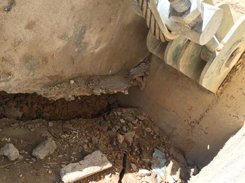 Xung quanh khu vực mố cầu được đơn vị thi công dùng dây vây làm hàng rào cấm người dân qua lại. Đứng từ bên kia cầu, có thể thấy rất rõ từng mảng đá lớn quanh mố cầu bị sụt lún, vỡ toác. Cả khu vực mố cầu bị tách gần như hoàn toàn trụ cầu. Khi PV bước xuống, từng mảng bê tông, đá rung lắc, đổ xuống chân cầu.