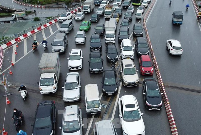 Đại diện Phòng CSGT Hà Nội cho biết, tại chiều Minh Khai (trung tâm Hà Nội) - Long Biên, ùn tắc xảy ra tại khu vực đường dẫn lên cầu do hàng rào thi công cầu Vĩnh Tuy 2 thu hẹp lòng đường đoạn này từ 3 còn 1 làn đường.