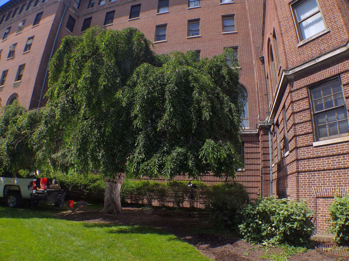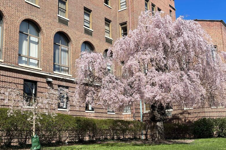 Những cây anh đào cành buông ở khu ký túc xá Union Memorial được chiết từ cây gốc. Chúng được gọi là "Capone nhí". Còn cây anh đào quà tặng của Capone tiếp tục ra hoa rực rỡ mỗi mùa xuân, thu hút ánh nhìn của người ngang qua. Ảnh: Union Memorial Hospital.