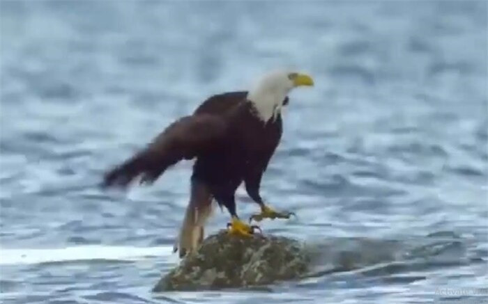 Trong tình huống này, con đại bàng hói đứng trên một rạn san hô trên biển. Khi nhìn thấy một con cua nhỏ bé, đại bàng hói rất khinh thường, nó ngạo nghễ bước đến, lập tức mổ vào thân cua, tóm gọn con mồi với tốc độ cực nhanh, định thưởng thức một bữa tiệc thịnh soạn.