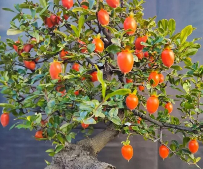 Cận cảnh một cây hồng đá có gốc xù xì, ra quả chi chít được giới chơi cây săn lùng.