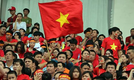 Trên khán đài là "biển" cổ động viên mặc áo đỏ sao vàng, reo hò cổ vũ sôi động.